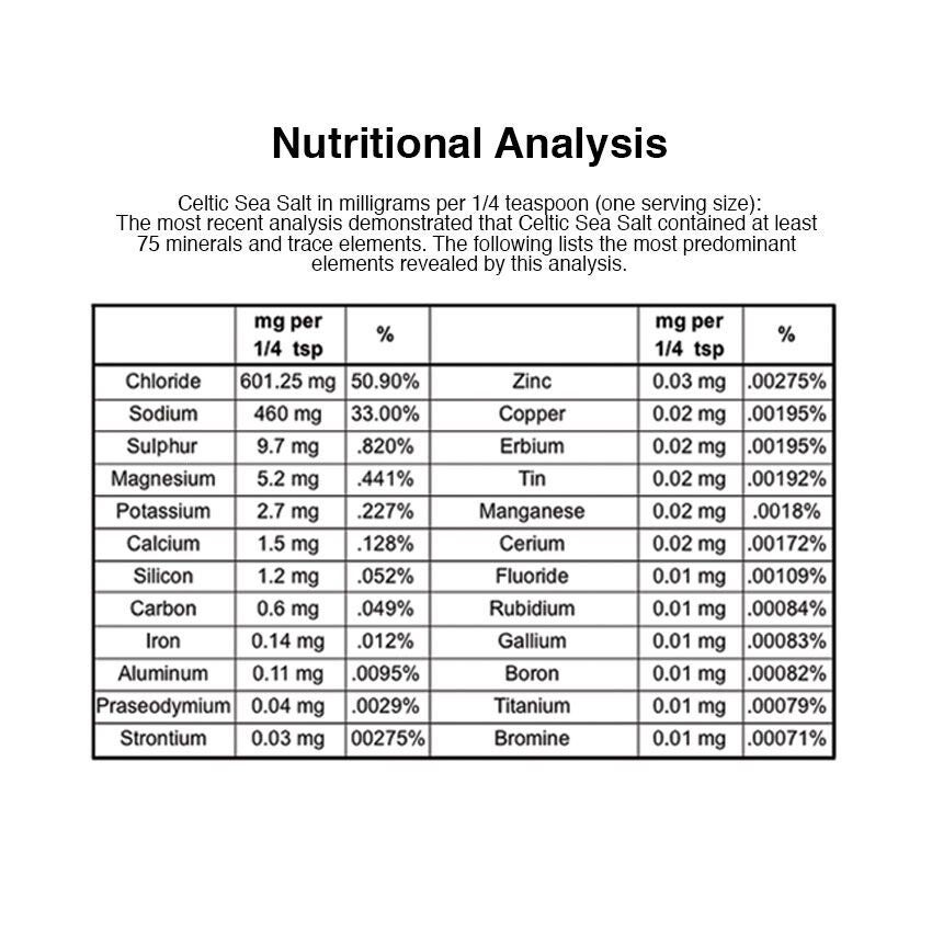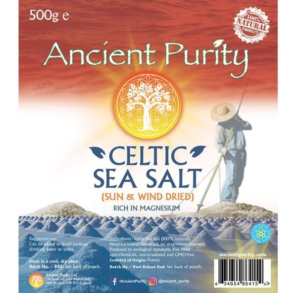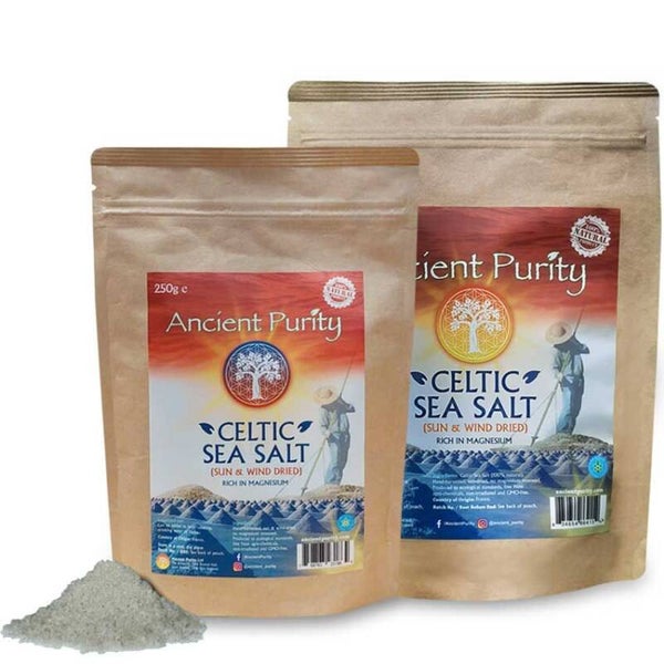 Ancient Purity Presents Celtic Sea Salt. This is the Highest State, most Untouched Celtic Sea Salt, it is Naturally Air and Sun-Dried and collected by hand with wooden tools to preserve its "living enzymes". It is a magnificent Super-Food abundant in essential Minerals, including the master mineral Magnesium. Trace elements are found in minute quantities in seawater and in natural unrefined sea salt but are often absent in food. It's the Real, Grey, Course Salt that should be the only choice for a Salt. Celtic Sea Salt selected by us is Raw Untouched, Moist, Magnesium Rich, and Living Salt. Sourced from the northwest coast of France, where it is harvested after seawater evaporates from clay ponds near the shoreline. Live minerals and trace elements provide natural grey Celtic Sea Salt with its less salty flavour and health benefits, such as enhanced digestion, resistance to infections and bad bacteria and increased alkaline levels. Simply replace your table or standard salt and enjoy.