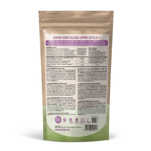 Ekopura Vegan Collagen Support is specially developed to stimulate the natural production of collagen by your body, without animal ingredients. Perfect for anyone who follows a plant-based diet or is looking for a sustainable alternative to fish and beef collagen.